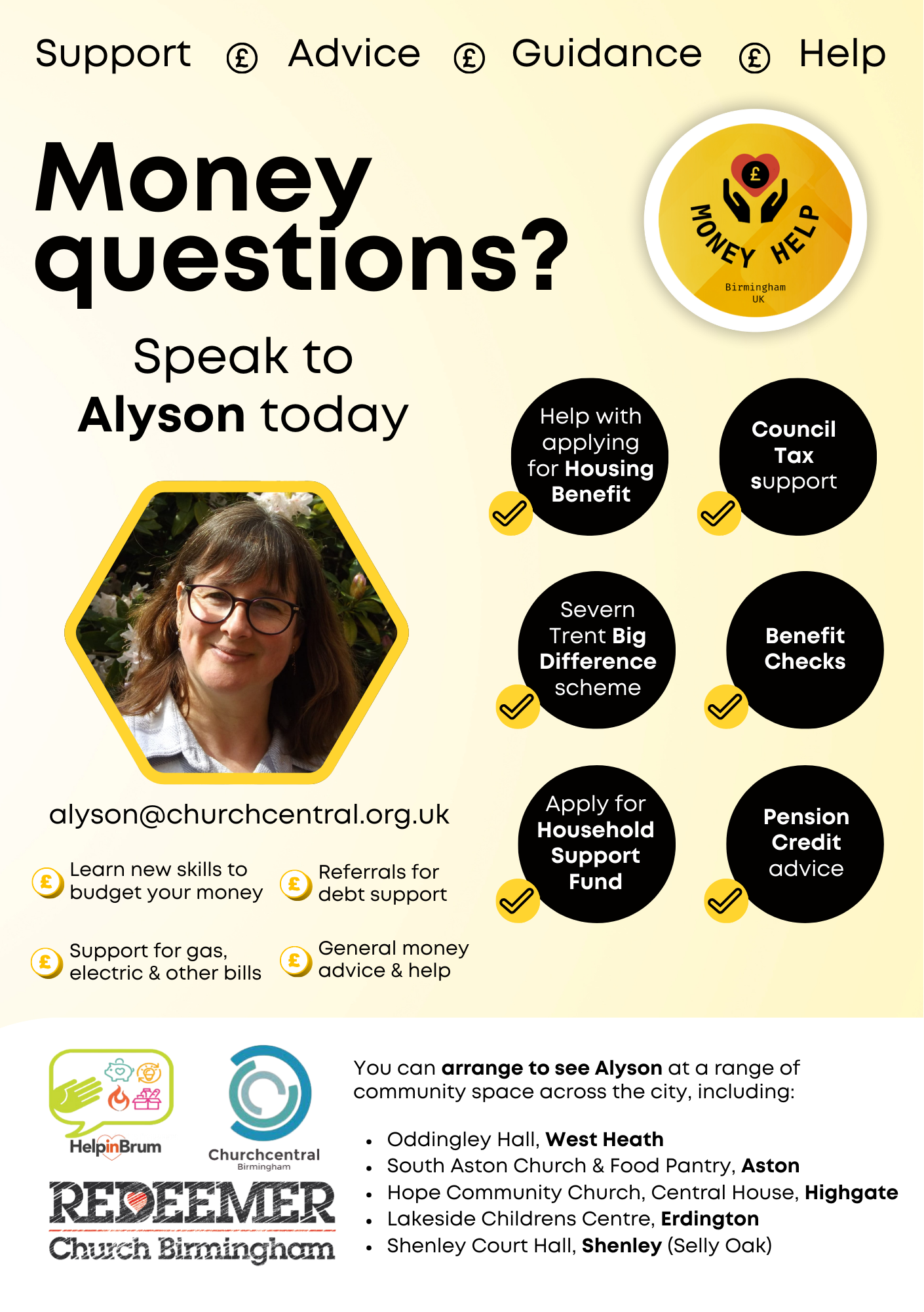 Meet with Alyson about benefits, household support fund, bills and more.